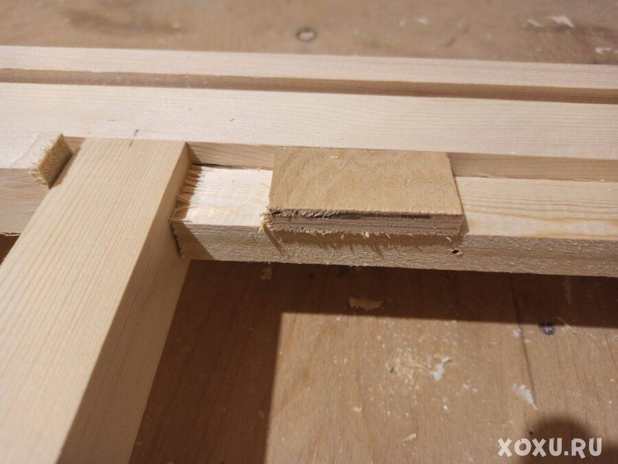 - На верхнюю и нижнюю часть панели заполнения надеваем горизонтальные детали обвязки. Шипы загоняем в паз, а для фиксации используем клей по дереву.