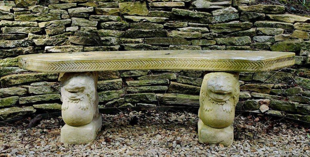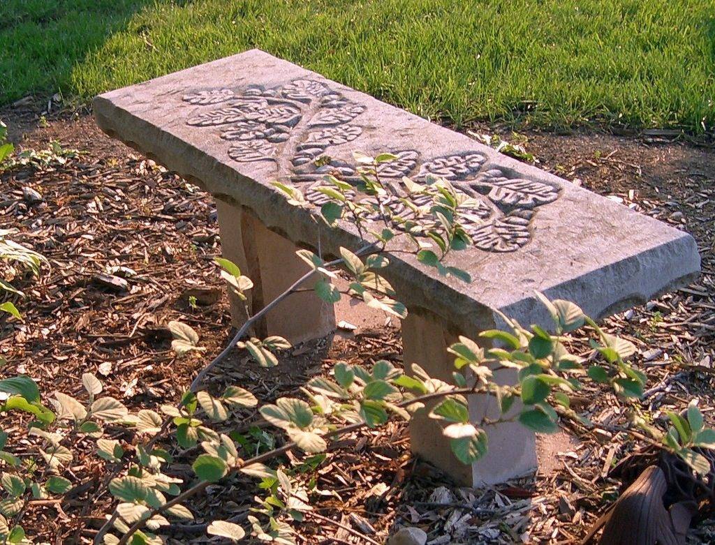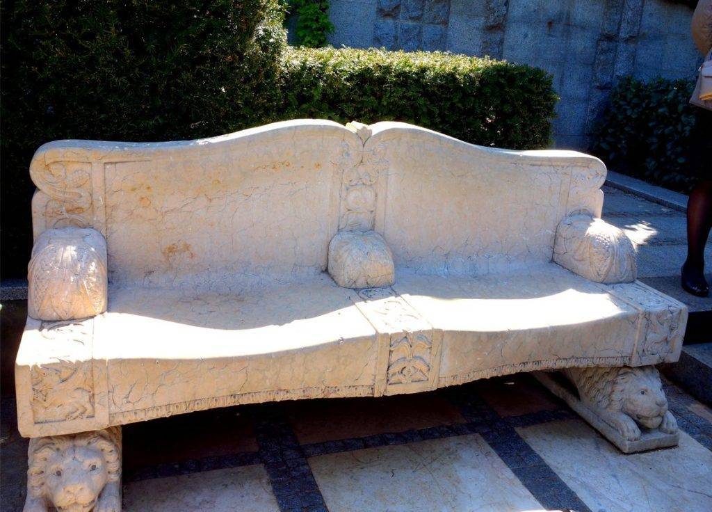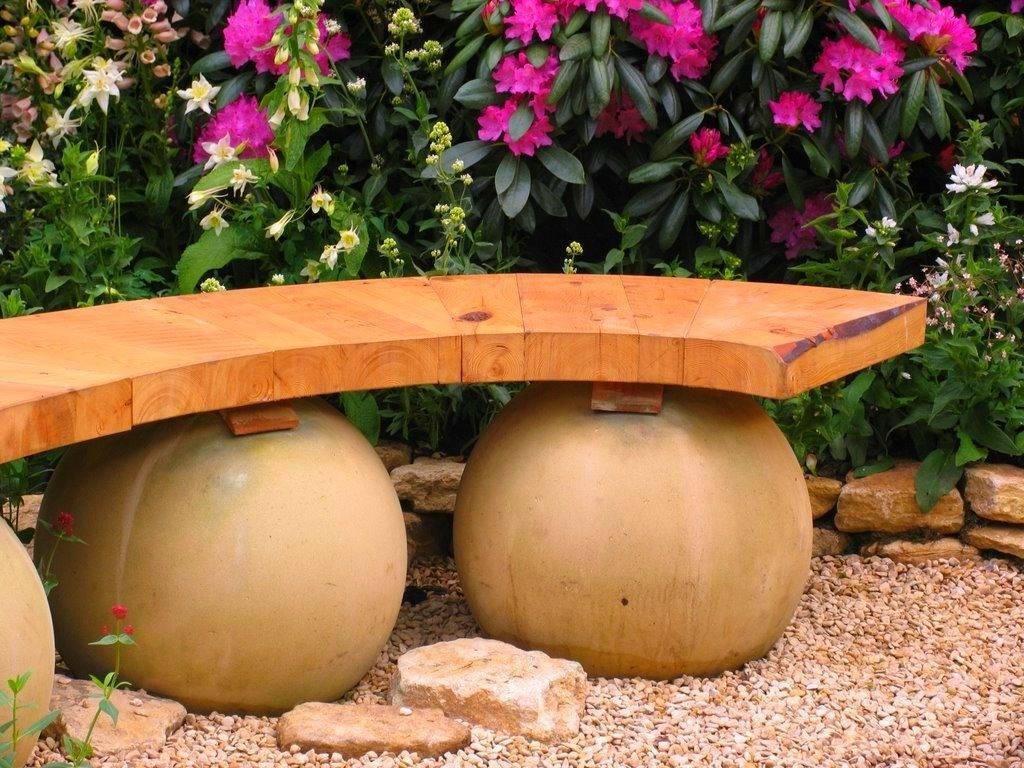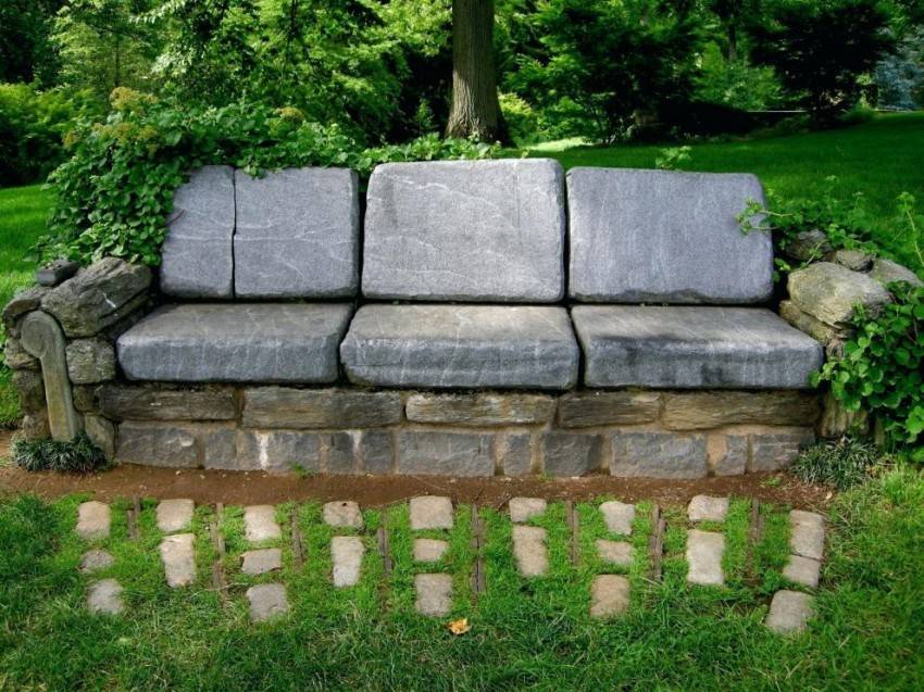Здесь необходимо очень тщательно подойти к выбору места, чтобы скамья прекрасно смотрелась на фоне сада, всего участка, украшала его. Есть один недостаток такой скамьи: камень сильно холодит, надо продумать как утеплить сиденье.