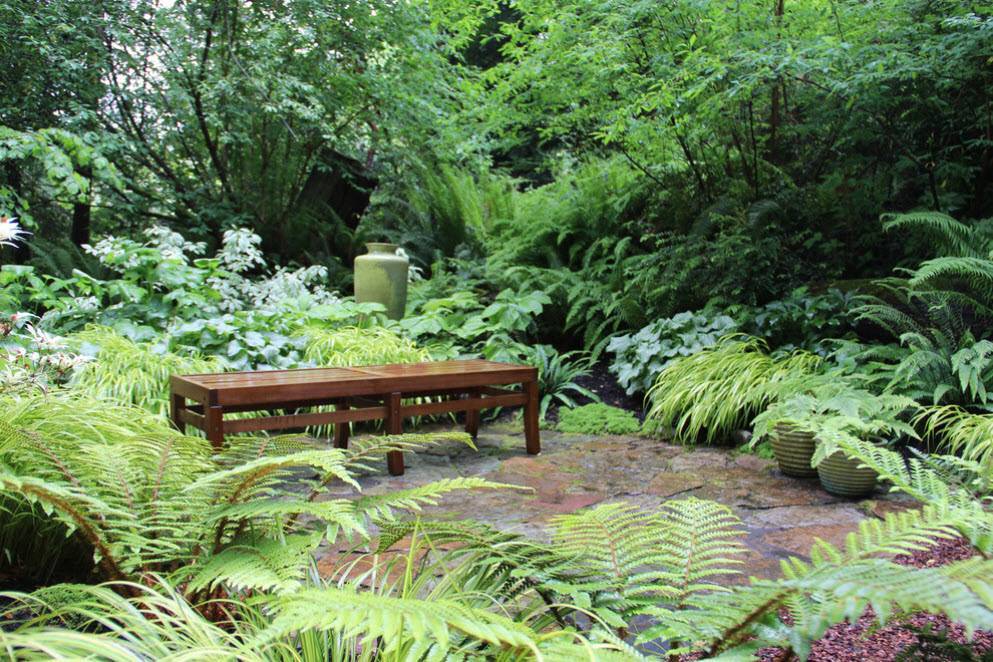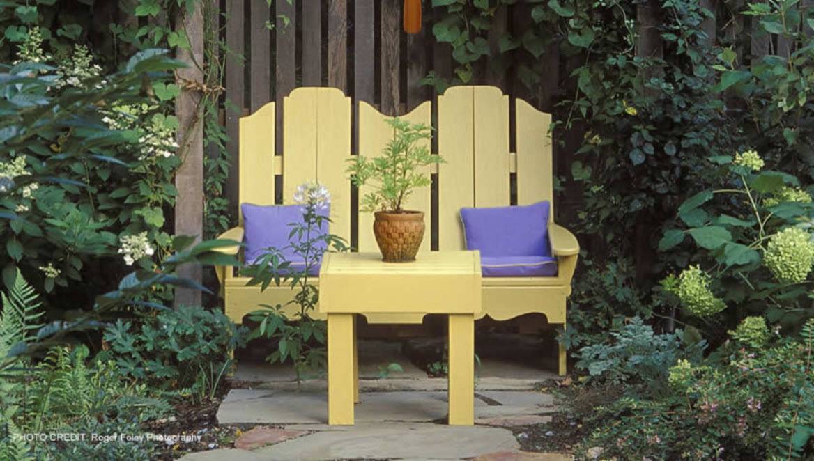 Если на участке есть водоем, то обязательно возле него поставьте небольшой диванчик.