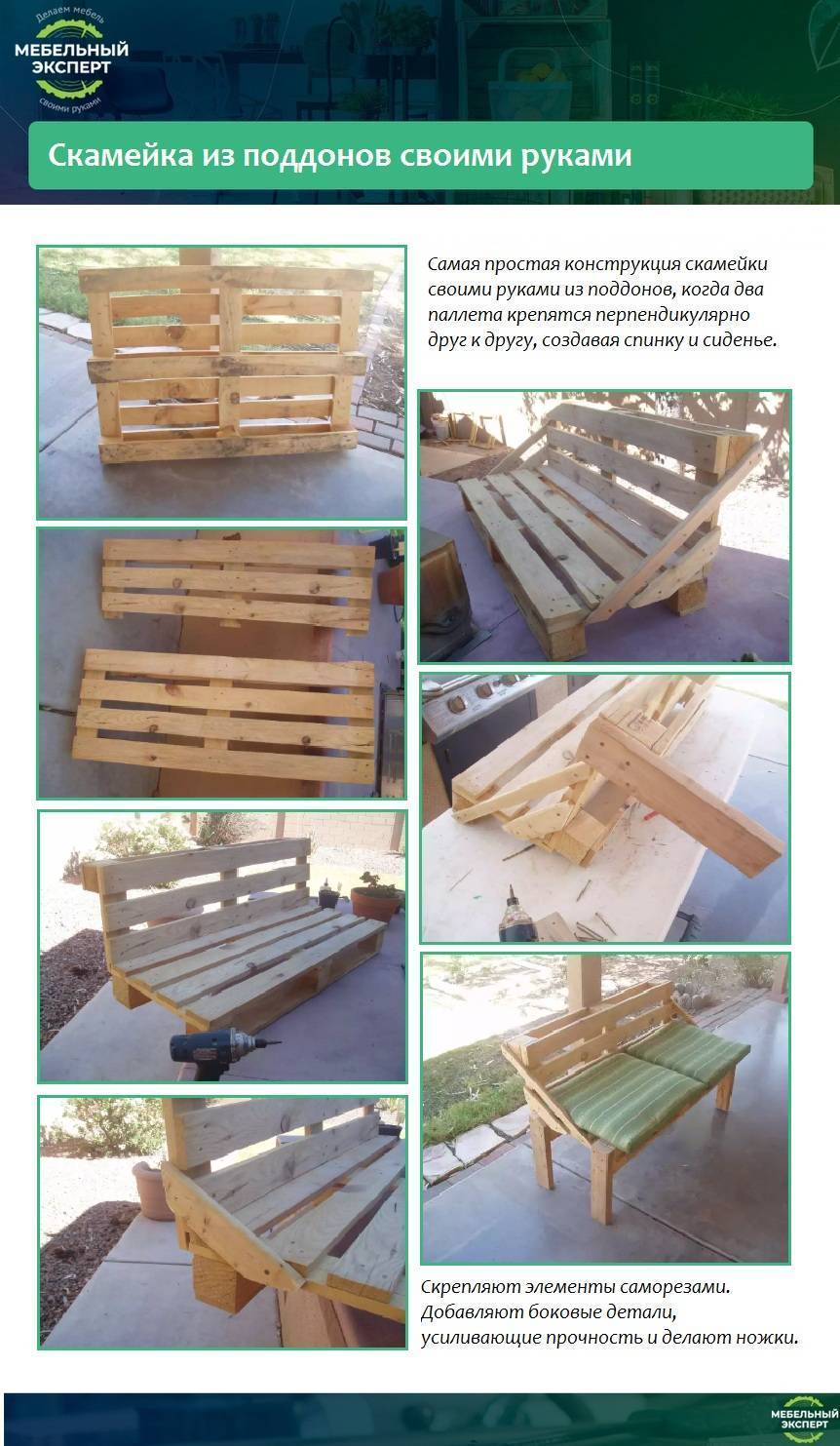 Дачную садовую скамейку для внутреннего пользования можно делать из любого материала, включая поддоны, с ящиком для хранения инструментов или мелких предметов, трансформеры, которые при желании превращаются в другой полезный предмет мебели, и старые стулья.