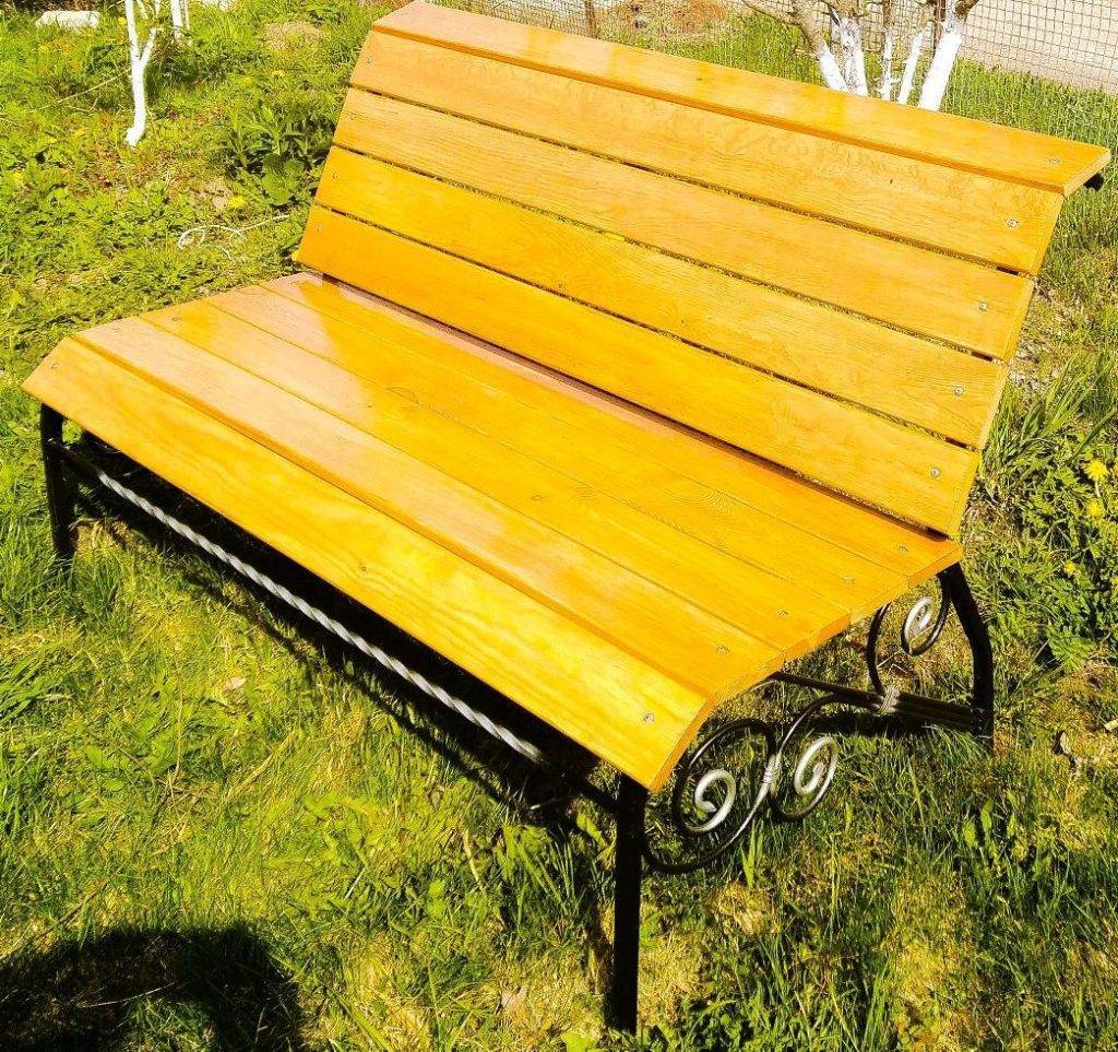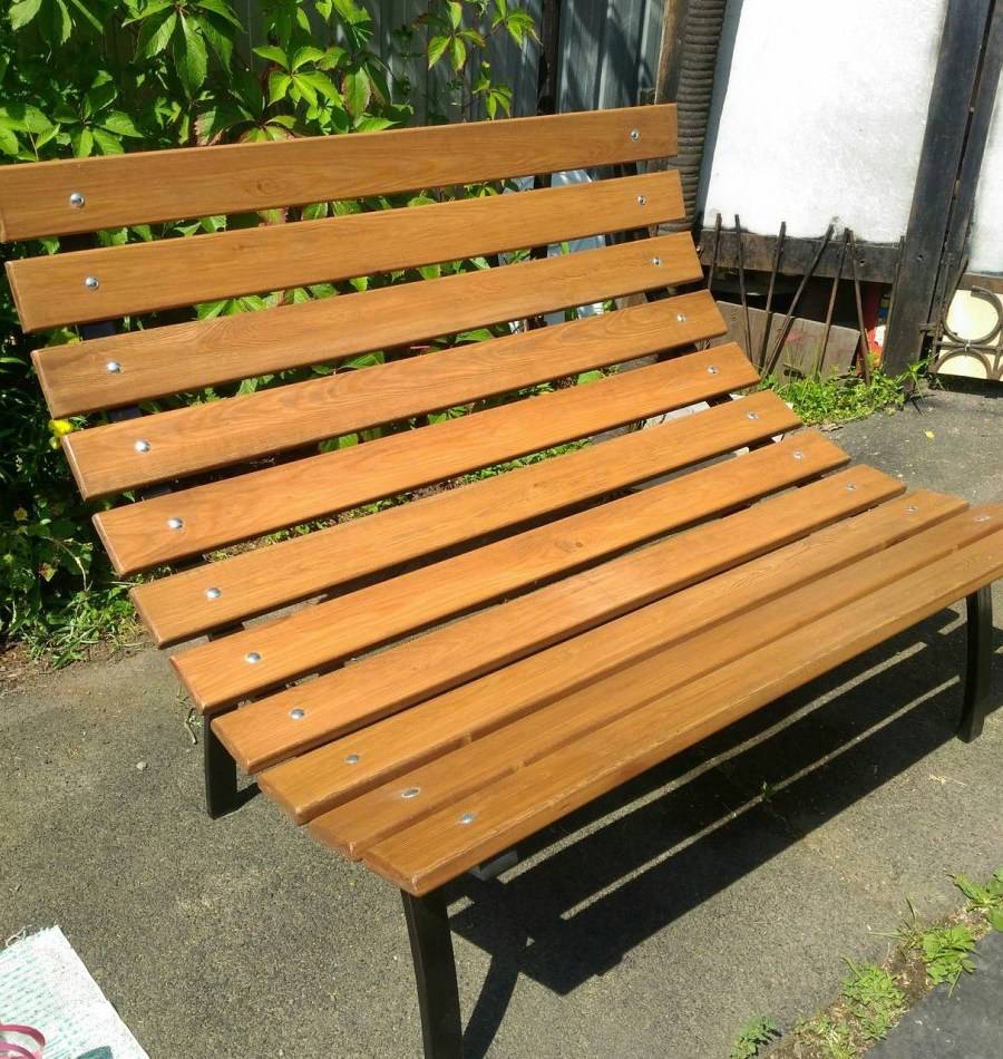 - Чтобы завершить дачную скамеечку своими руками, осталось только отшлифовать доски и вскрыть изделие для дачи лаком.