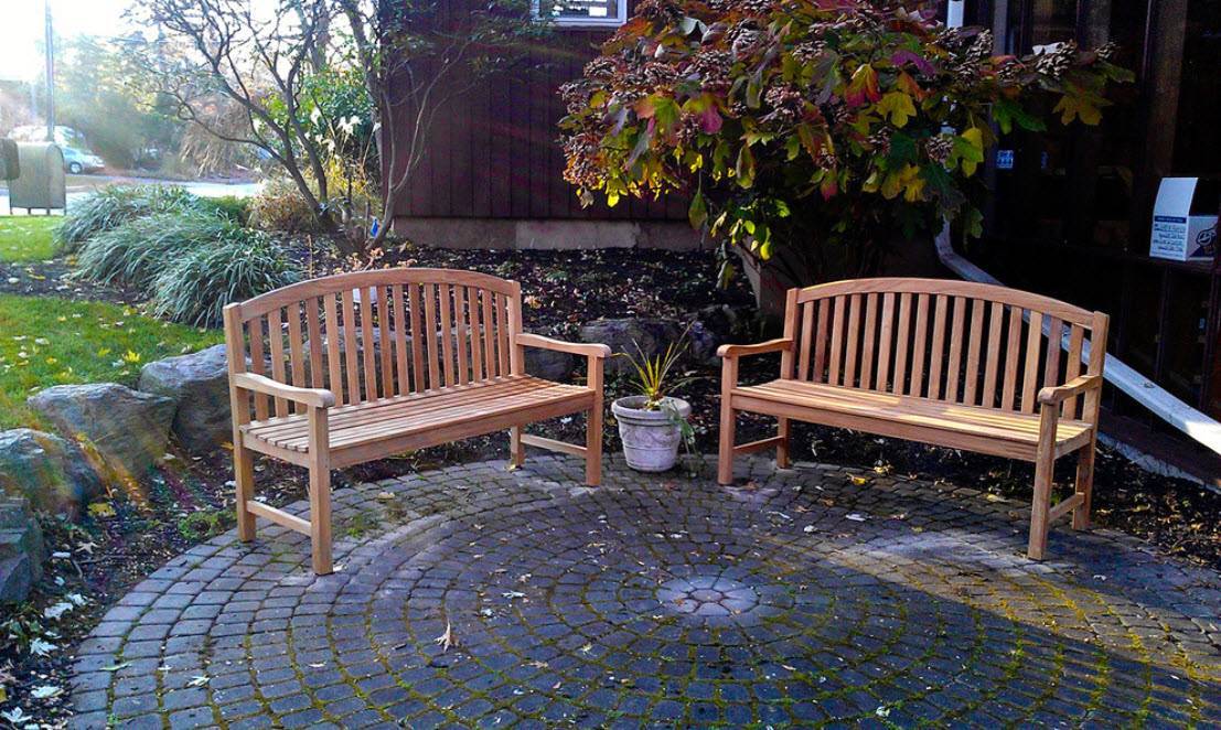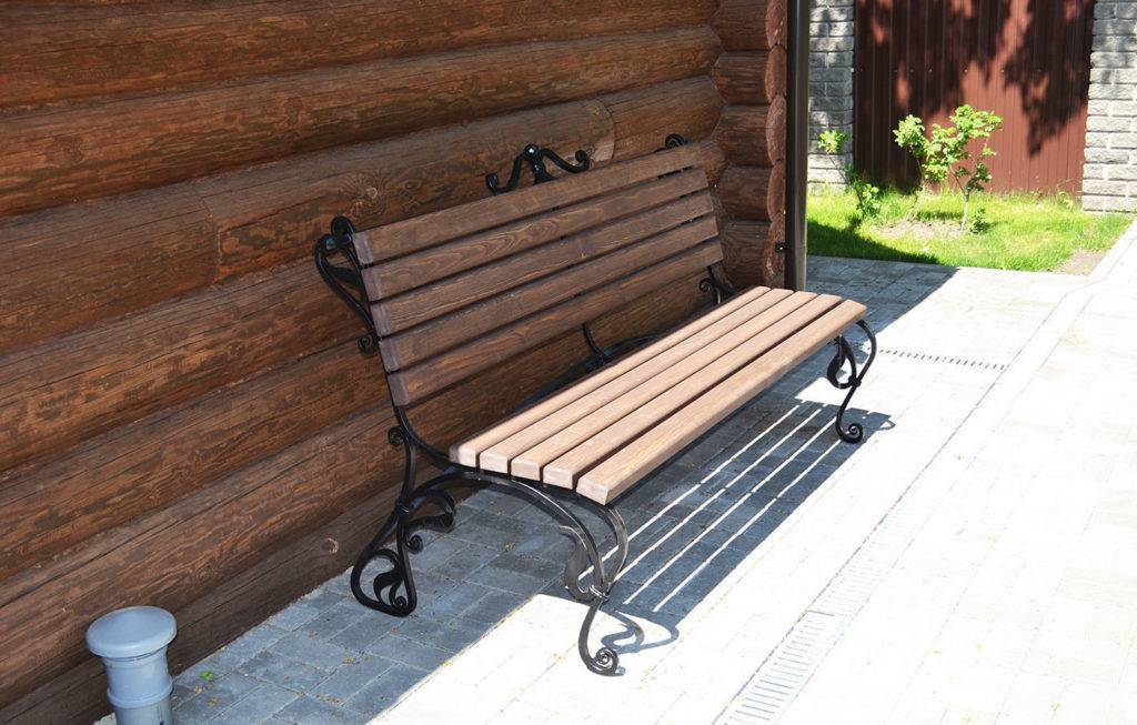 - Для украшения загородного участка следует подбирать изделия, гармонирующие с другими объектами на придомовой территории, например, кованые лавочки, модели с аркой. Если на участке есть сруб, сидушка в виде брёвен станет удачным вариантом.