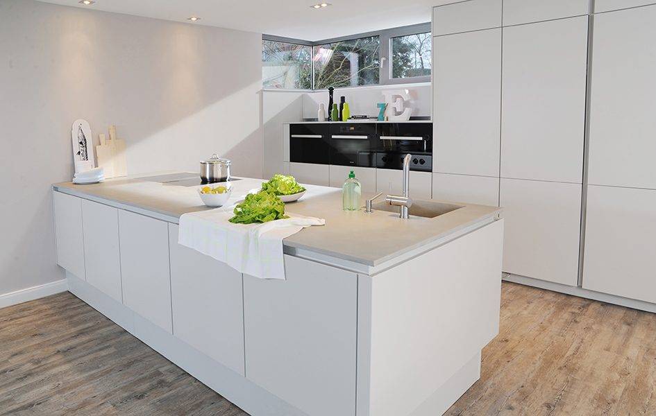Яркий белый дизайн совмещенной гостиной и кухни с декоративными балками