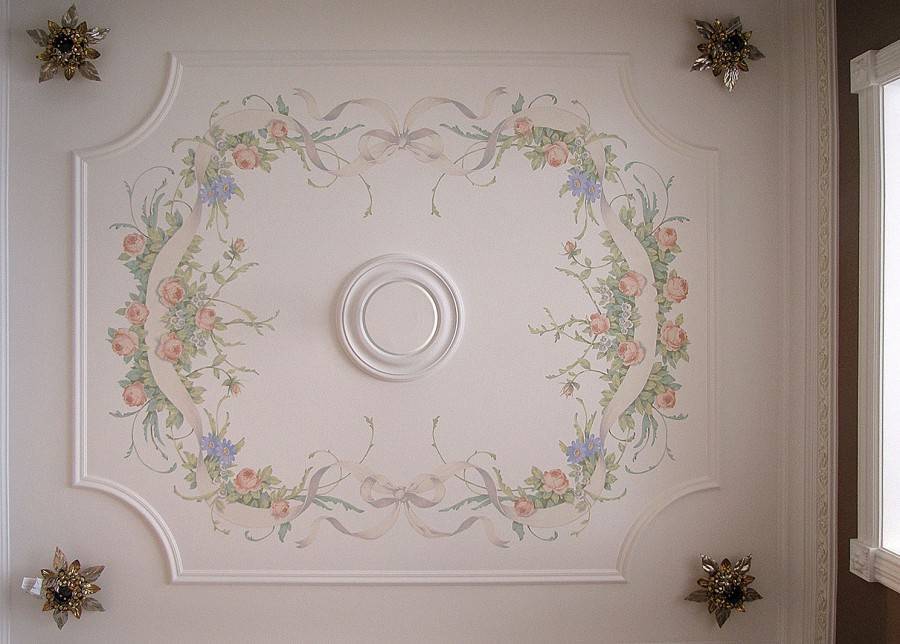 Проще простого выбрать нужный трафарет с несложным линейным рисунком, закрепить его малярным скотчем на потолке в нужном месте, а после окрасить в нужный цвет.