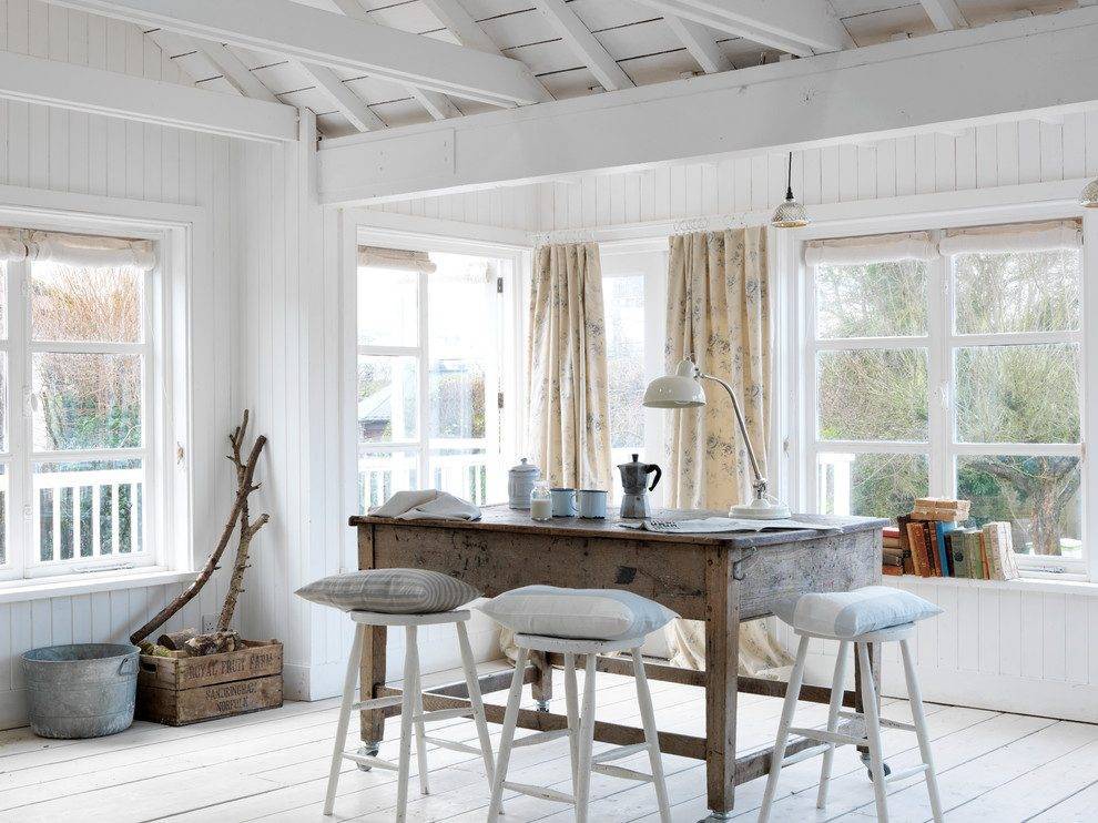 Другой классический вариант – потолочные балки и полы из одного материала на фоне белых стен. Подобное решение нередко практикуется в имитации ретро или кантри-стилистики.