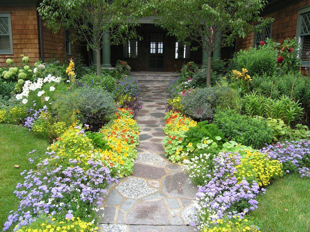 Чтобы воссоздать этот стиль нужно высадить на участке много разнообразных цветов. Они могут располагаться на цветниках, в вазонах и кадках. Цветникам желательно придать правильную форму. Расположить их лучше симметрично. Для разделения зон нужно выложить ровные дорожки.