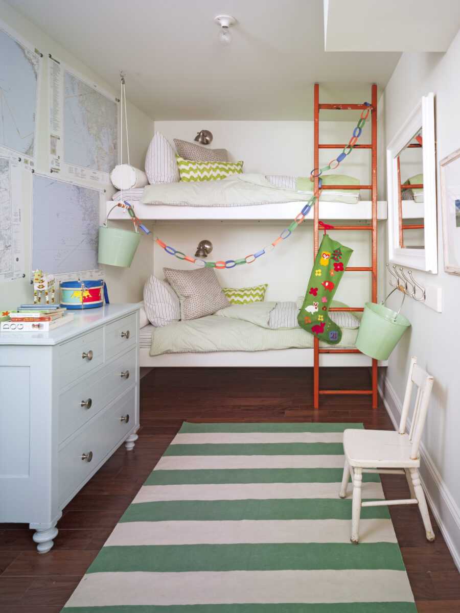 - установить двухъярусную кровать, оставшуюся поверхность зонировать, выделив пространства под остальные нужды.