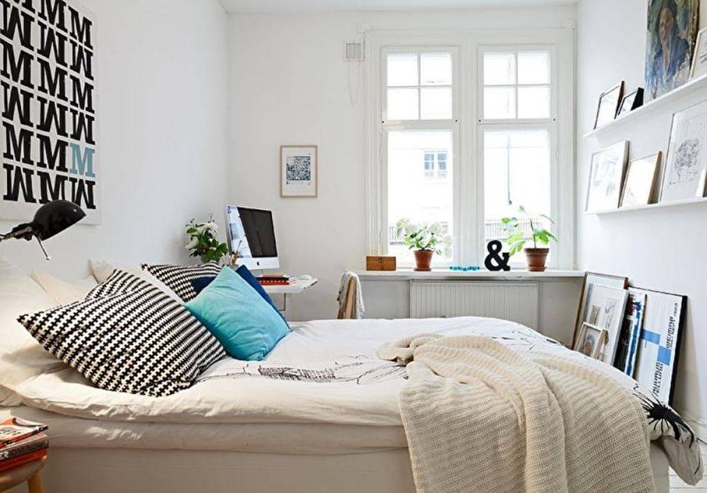 При крайне малых размерах помещения вполне можно обойтись самым минимумом – кроватью и шкафом. А ещё лучше – использовать альтернативный вариант шкафа в виде небольшой конструкции с плечиками для одежды.