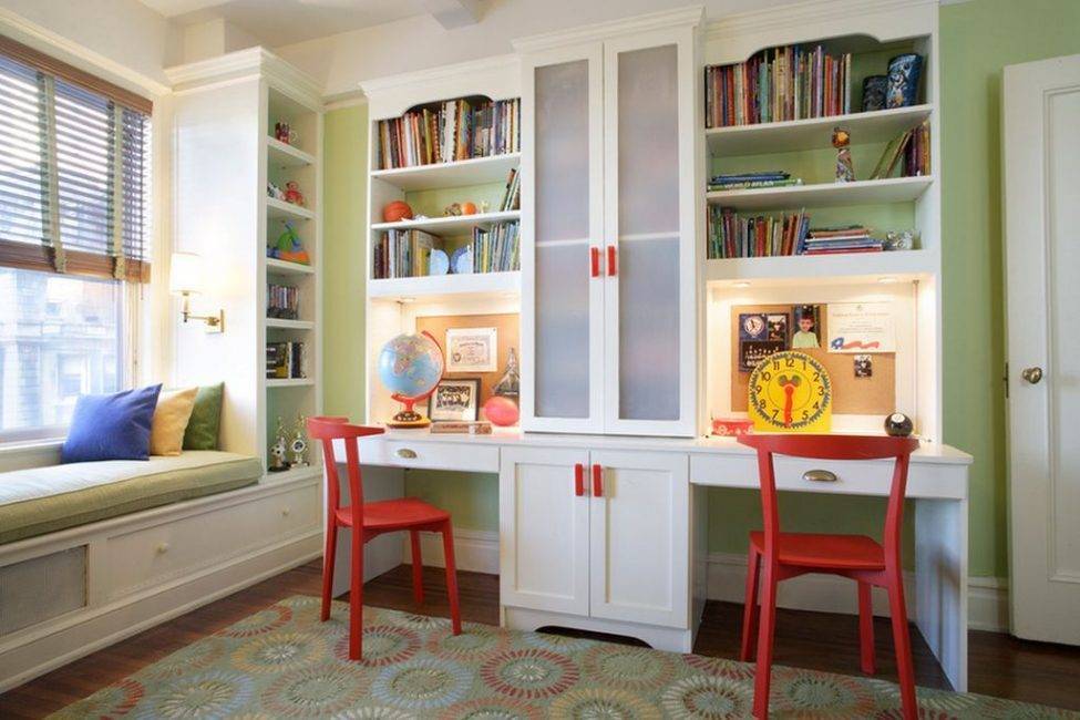 Когда ребята пойдут в школу, у них уже будут места для серьезных занятий. Если в комнате одно окно, оба стола для выполнения уроков должны быть освещены одинаково. Если окон два, считайте вопрос решенным!