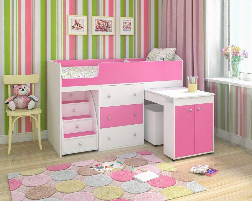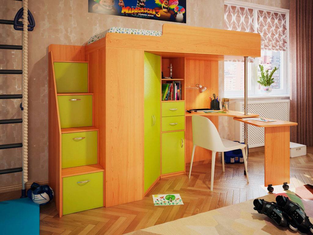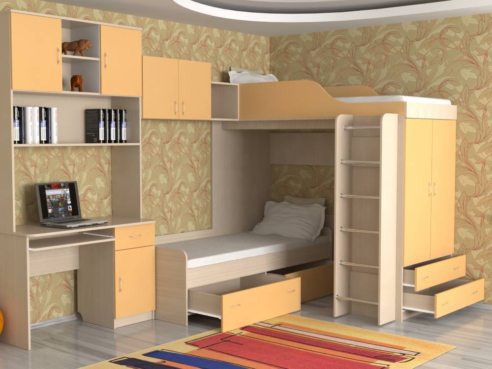 Позволяет разместить и спальные места, и рабочее место, и даже шкафы и ящики. Это самый настоящий детский комплекс, компактный и комфортный.