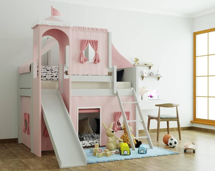 На фото кровать-чердак с тентом в виде сказочного замка. При необходимости тент можно снять для стирки или починки.