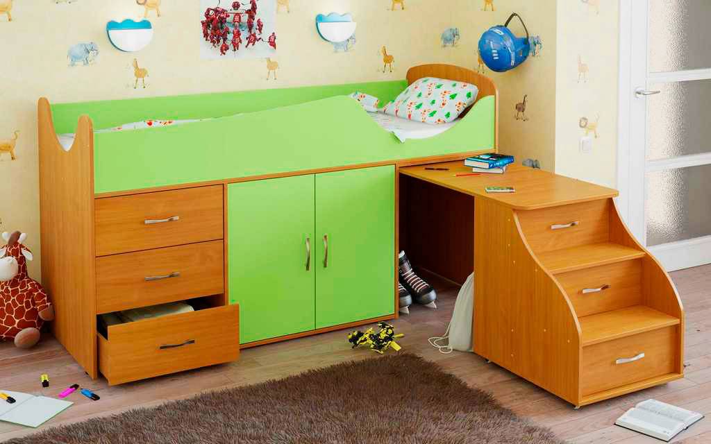 Традиционные вариант стола-кровати подойдут для школьников, тогда как кровать-чердак можно использовать для активных подростков, а изделия с выдвижными столешницами способны привлечь внимание малышей