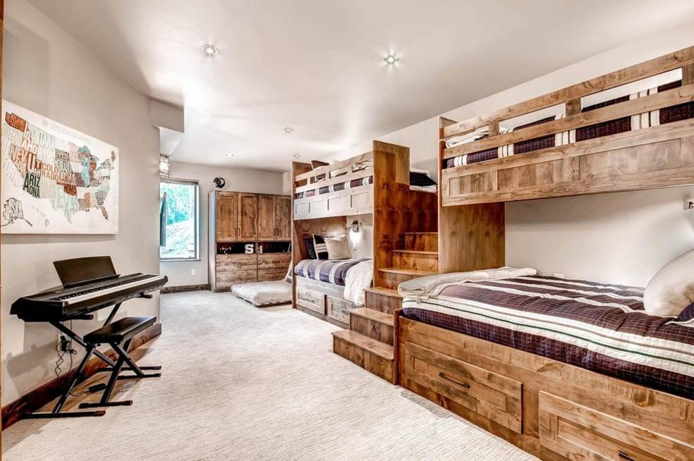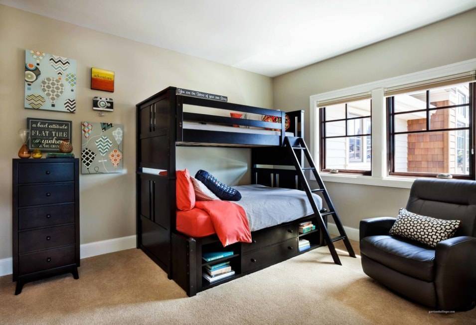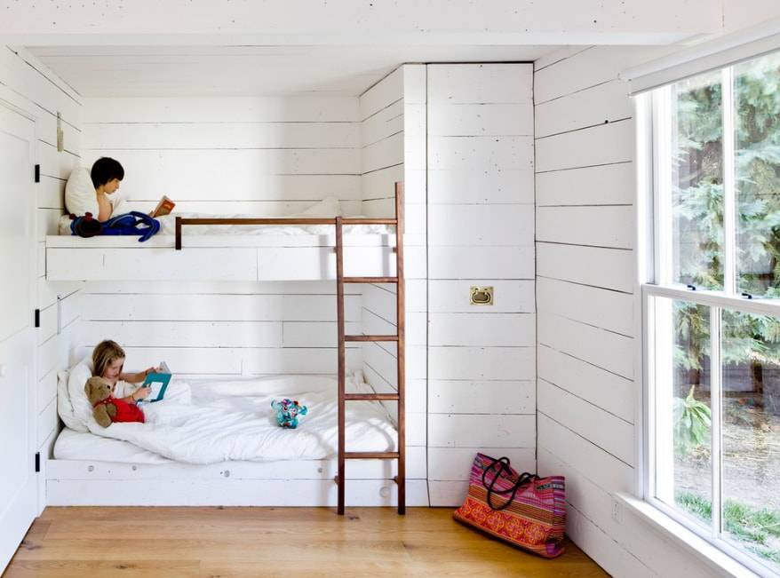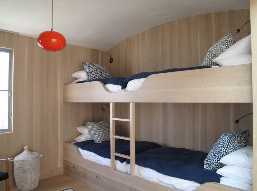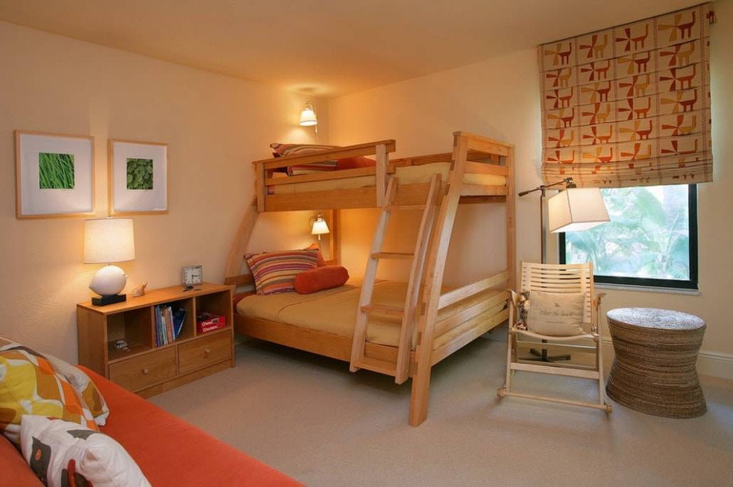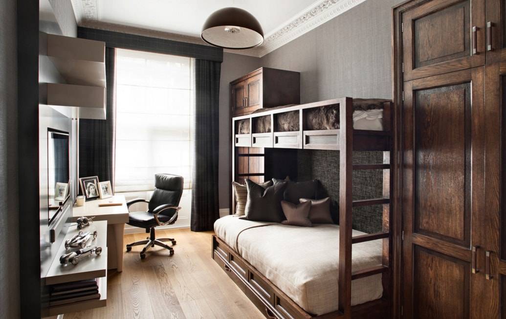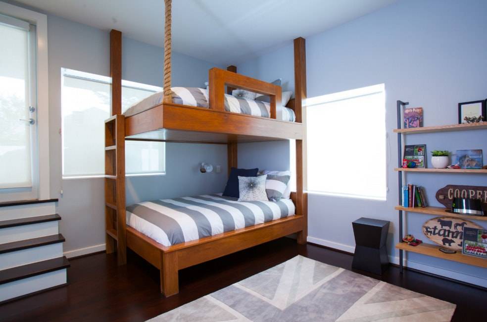 К примеру, двухъярусная кровать в простом и лаконичном дизайне без сложных конструкций смотрится очень стильно. За счет этого в комнате будет много свободного пространства, которое можно использовать по своему усмотрению.