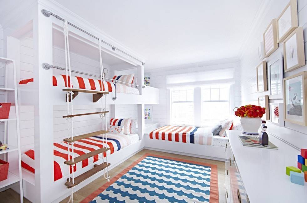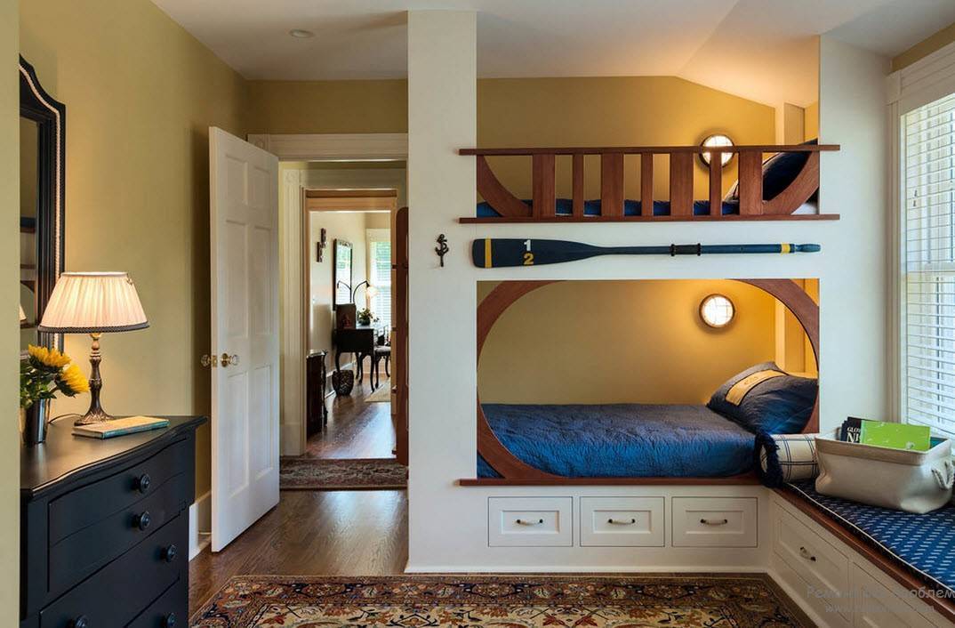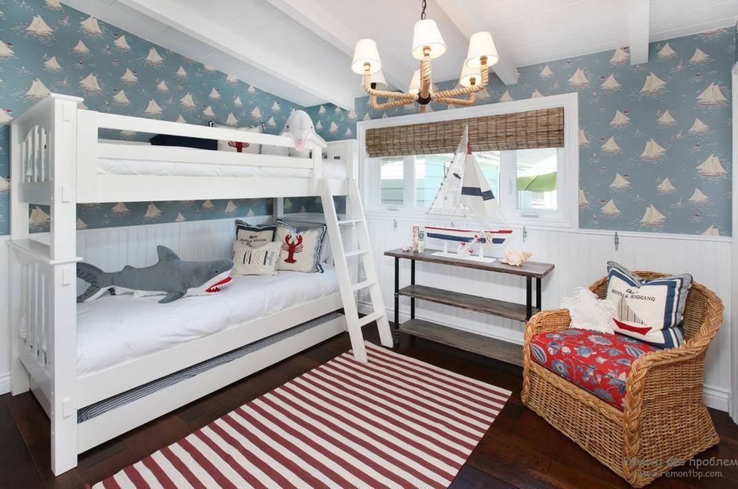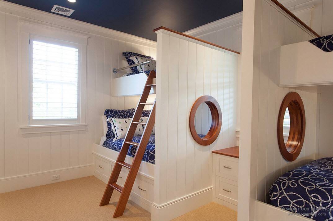 Очень красиво выглядят комнаты в морском стиле. Особенно, если тщательно продумать дизайн и добавить необходимые детали. К примеру, кровать в виде каюты или же с декором из каната смотрится потрясающе. Мальчишки точно будут в восторге от такого решения и с радостью будут проводить время в своей комнате.