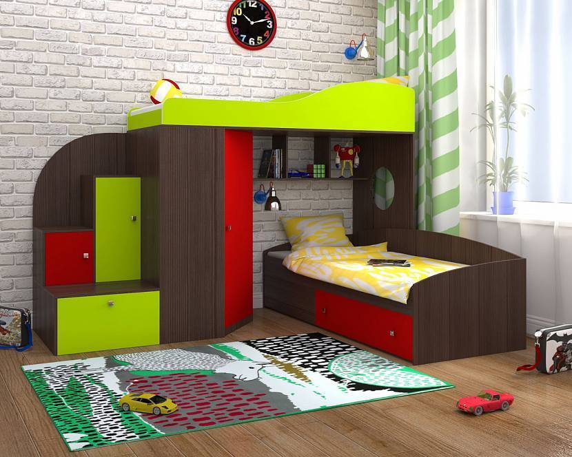 Перед покупкой нужно оценить и сравнить габариты кровати с горкой с предполагаемым местом установки. Чтобы мебельный гарнитур не смотрелся громоздко, его размещение в комнате должно составлять около трети от всего пространства.