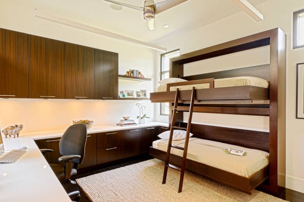 Существует огромное множество двухъярусных кроватей с компьютерными столами, а также всевозможными полками и шкафчиками. Они помогают организовать своего рода рабочий кабинет в очень ограниченном пространстве и заодно упорядочить вещи в комнате.