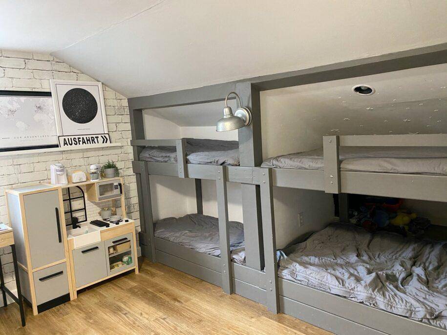 Для многодетной семьи, где проживает четыре и более ребенка, можно организовать двухъярусный комплект, состоящий из двух и более одинаковых секций. Несмотря на то, что для такой конструкции потребуется значительно больше материала, спальные места можно аккуратно расположить вдоль одной из стен комнаты, тем самым сэкономив свободное пространство.