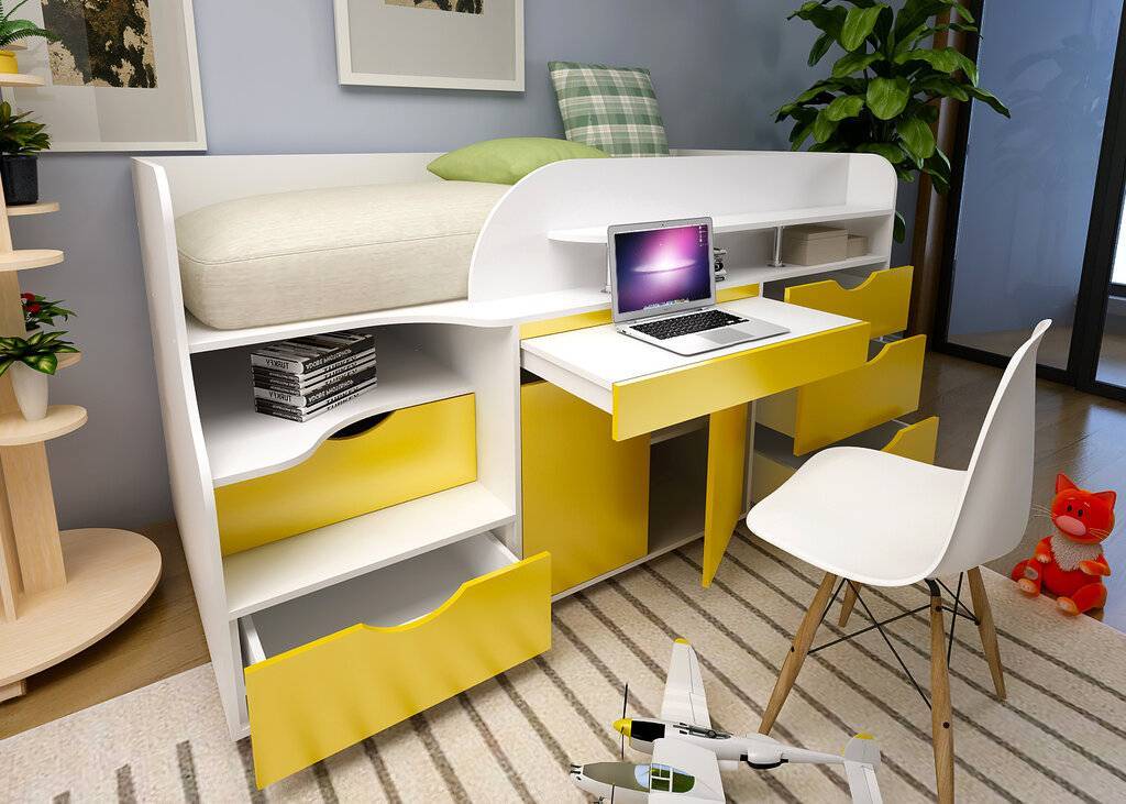 - Для небольшой детской комнаты необходимо подбирать максимально функциональный шкаф-кровать, который будет совмещать в себе несколько дополнительных поверхностей. Существует двухуровневая модель, которая оснащена партой и шкафом с ящиком для письменных принадлежностей или для учебников. Такой вариант очень удобен тем, что днем есть полноценное рабочее место, чтобы выполнять домашнее задание, а вечером данное пространство трансформируется в удобное спальное место.