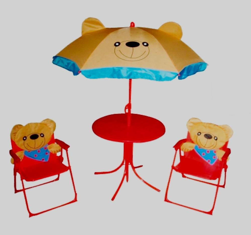 Комплект можно смело назвать новинкой. Вызывает неподдельный восторг у маленьких пользователей. Удобный столик оснащен интересным зонтиком диаметром 1,1 м в виде мишки. В наборе присутствует два кресла с параметрами 36*32*26/50 см. Высота стола – 47 см диаметр – 50 см. Набор в красно-бежевом цвете. Каркас изготовлен из стальной трубы, вскрытой полимерной краской. Вес товара – 4 кг. Кресло складное, пошито из прочной ткани Oxford, выдержит максимальную нагрузку в 20 кг. Набор можно установить как в доме, так и на свежем воздухе.