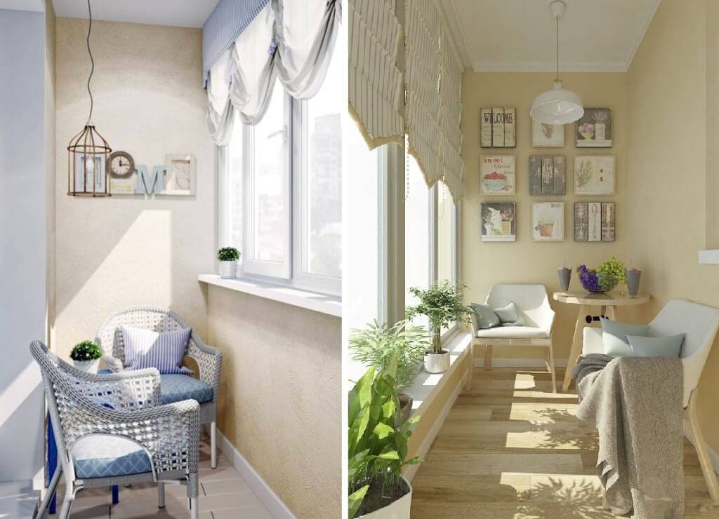 Франция вдохновляет. Стиль «Прованс» использует светлые, натуральные материалы в отделке. В его основе – белый потолок и обшитые деревянными панелями стены. Для создания искусственной старины стены покрывают декоративной штукатуркой ( подробнее в статье “отделка балкона декоративной штукатуркой” ). Дизайн подразумевает плетеную, либо деревянную мебель.