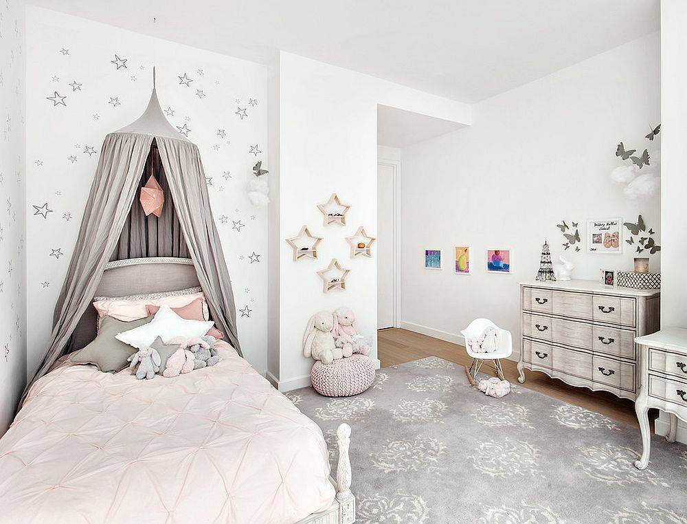 Спальня девочки обычно выполняется в персиковых, нежно-розовых, лавандовых или бежевых тонах. Кровать дополняется трикотажным покрывалом, меховым или овчинным пледом и множеством подушек с абстрактным, геометрическим или национальным принтом. Над спальным местом можно расположить балдахин из ткани нежного пастельного оттенка.