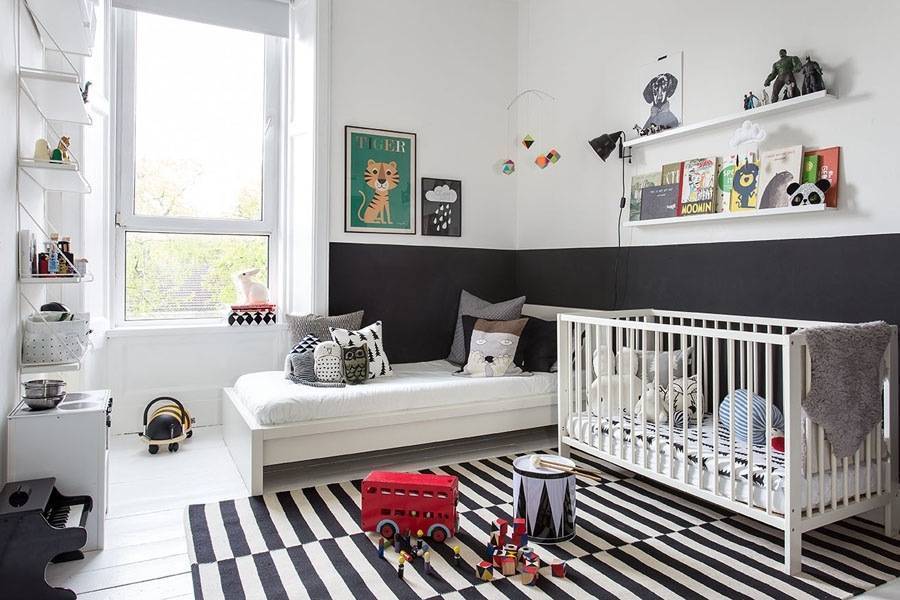 для мальчишек в качестве основных цветов отделки стен можно использовать: голубой, синий, белый, черный, желтый. Разнообразить интерьер можно яркими и стильными игрушками, текстилем, декоративными подушками;