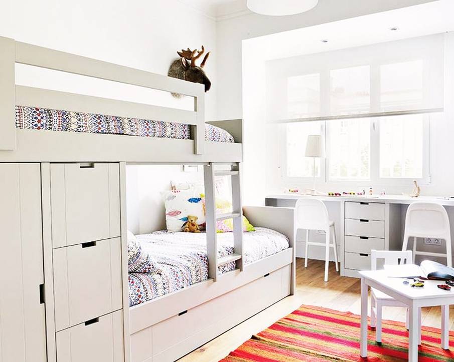 Оптимальным решением будет установка двухъярусной кровати, в случае если в спальне проживают два подростка или выбор модели-чердака с нижней частью, оборудованной системами хранения, рабочим или творческим уголком.