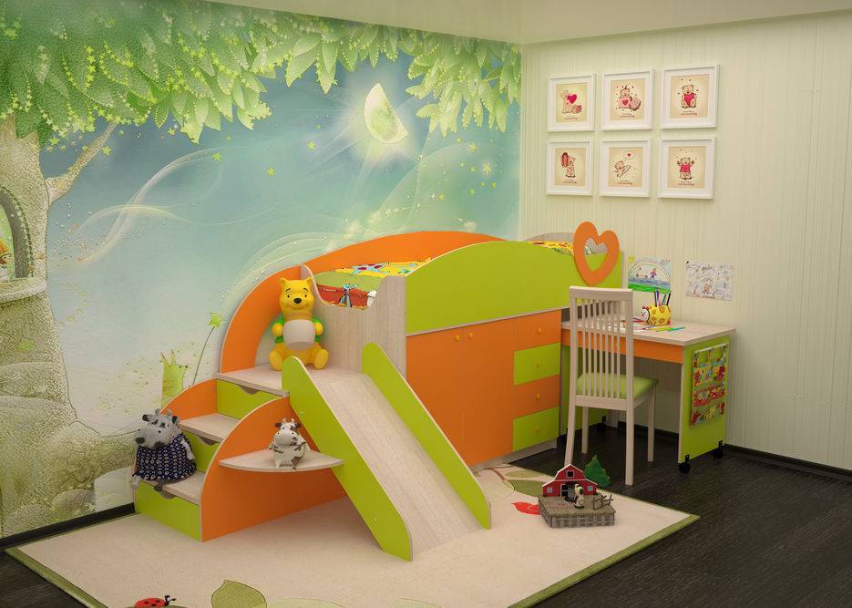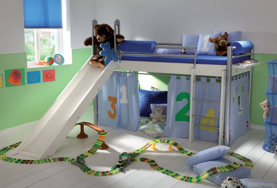 Все больше родителей при обустройстве детской комнаты стараются выбрать кровать-чердак. Сверху рассматриваемой конструкции установлено спальное место, а внизу находится пространство для работы, игры или хранения вещей. Рабочая зона обычно представлена письменным столом в комплекте с открытыми полками и выдвижными ящиками. Для активного ребенка можно выбрать двухъярусное спальное место со спортивной площадкой (канатом, баскетбольной сеткой, шведской стенкой или турниками). В качестве места хранения под верхним ярусом кровати может быть установлен комод, шкаф, полки и т. д.