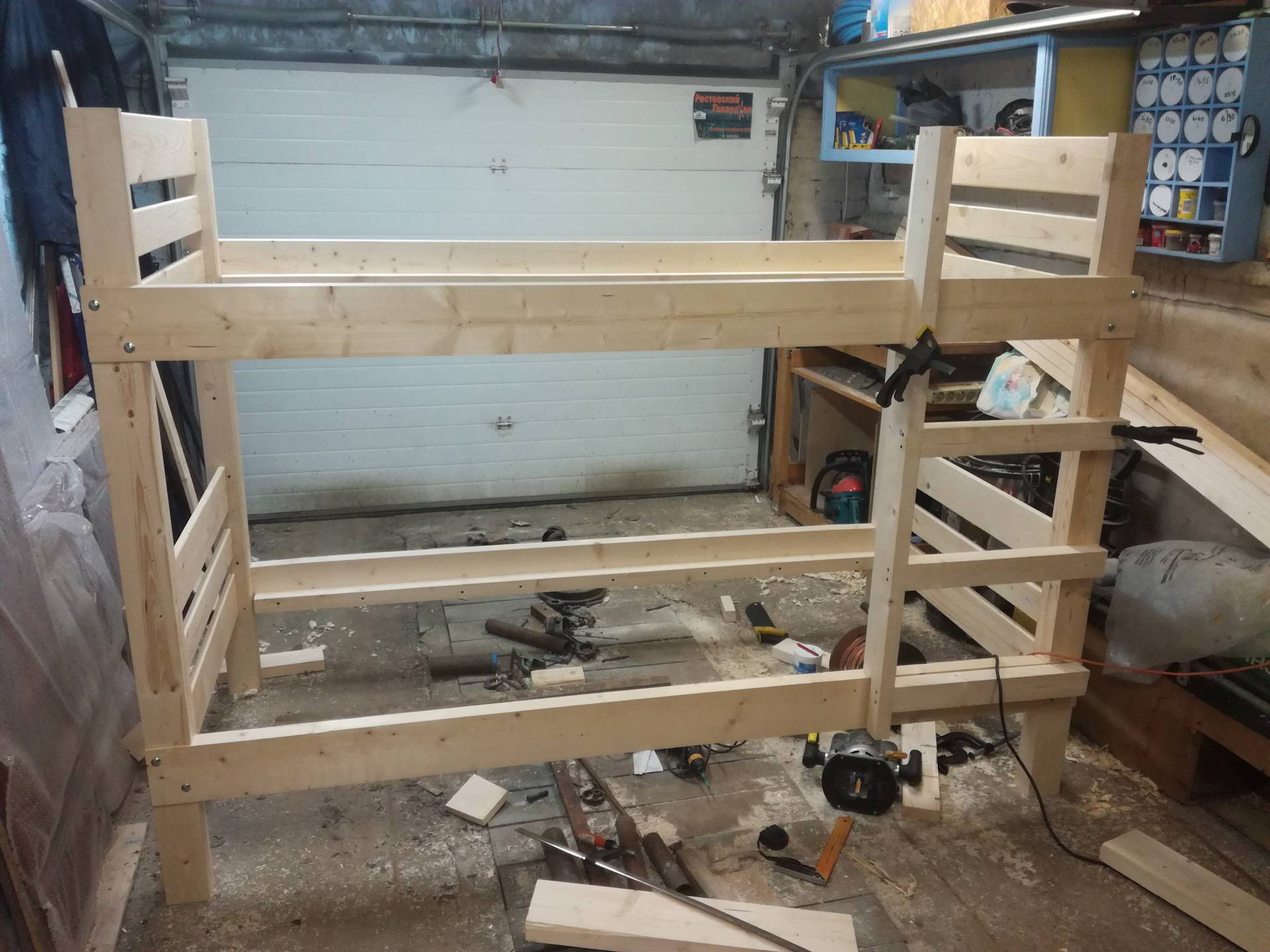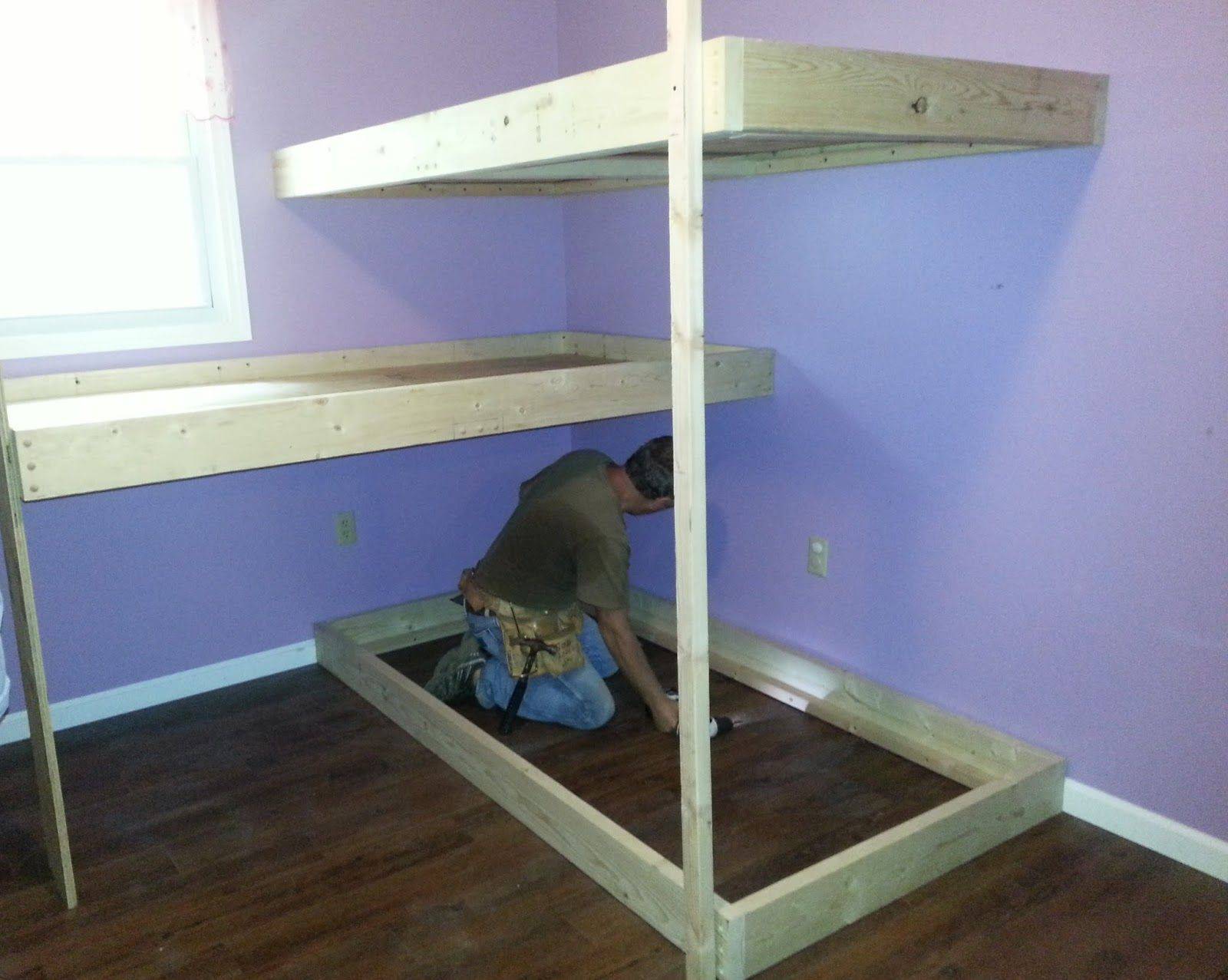 Сразу сильно не стоит скреплять между собой все детали. Сначала проверяется еще и внешний вид, а уже потом происходит полный монтаж. Сначала отдельно изготавливается каркас для стандартной кровати в двух экземплярах. Затем строится опора. После все соединяется и прикрепляется лесенка. Отделка выполняется в соответствии с дизайном интерьера.
