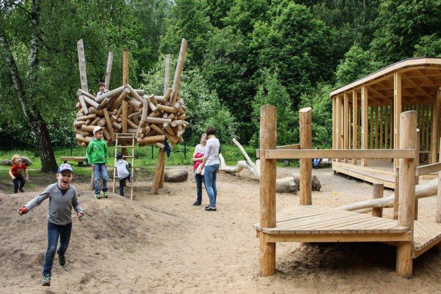 Еще одна из важных задач городской детской площадки – приблизить детей к природе и хотя бы на время перенести их внимание со смартфонов на окружающий мир. Сейчас в столице открыто несколько детских пространств с «природной» концепцией – игровые элементы и настил здесь выполнены из натуральных материалов и имитируют естественную среду
