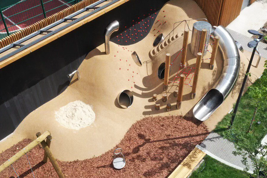 Очевидно, что в случае с детскими локациями в парках у архитекторов больше пространства для маневра, чем при обустройстве камерных дворов столицы. Однако даже в стесненных условиях можно найти оригинальное решение для постройки детской площадки, которое не будет умалять ее увлекательность. Например, один из «лайфхаков» планировки в небольшом дворе – более активное использование вертикального пространства. Игровые комплексы здесь начинают как бы «расти» вверх. Такой проект разработали, например, для двора столичного жилого комплекса на улице Малая Ордынка – здесь на площади размером чуть больше московской «трешки» разместили холмы в форме песчаных дюн, которые органично вместили в себя базовый развлекательный детский набор – горку, скалодром, песочницу, лазалки и тоннели.