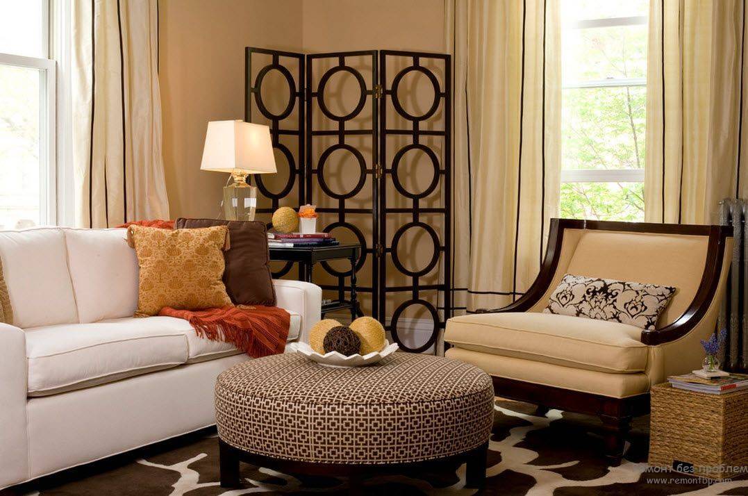 Хочется придать гостиной штрихи респектабельности и лоска – выбирайте черные или белые кожаные пуфы, цена их конечно выше, чем у текстильных аналогов, но ведь солидность окружающей атмосферы именно этого и требует. Тканевые же обивки нежных оттенков и с милыми узорами способны обеспечивать царствование теплоты и уюта в комнате.