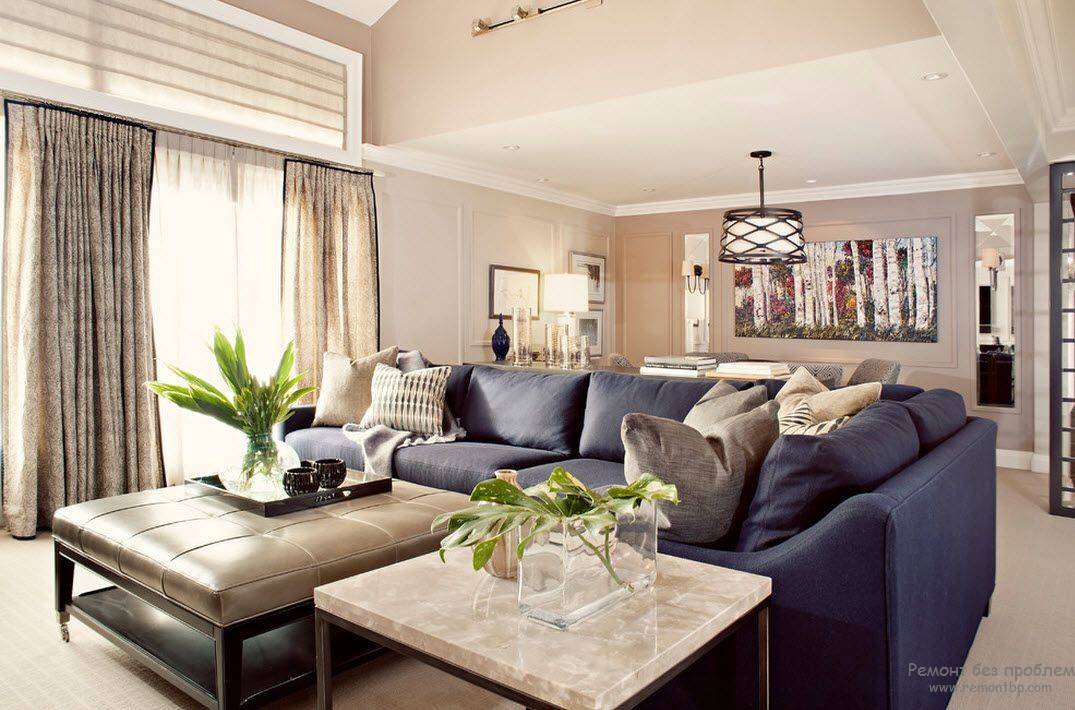На фото интерьер гостиной и пуфик честер синего оттенка, декорированный каретной стяжкой.
