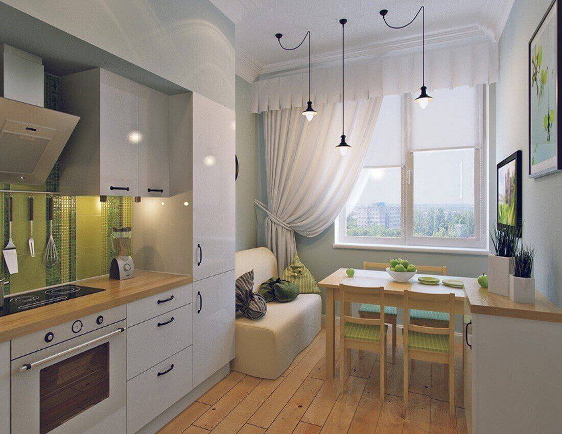 В маленькой кухне стоит избегать отделки с крупными орнаментами, на фоне светлых стен или мелкого узора мебель выглядит не так громоздко. Энергично будет смотреться кухня с диваном в зелёных оттенках как на следующем фото.