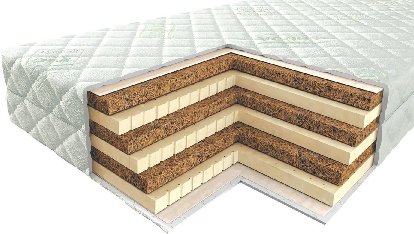 - Беспружинный. Такие матрасы выполнены из койры или латекса, состоят из нескольких слоев этих материалов.