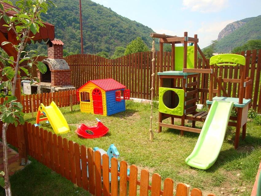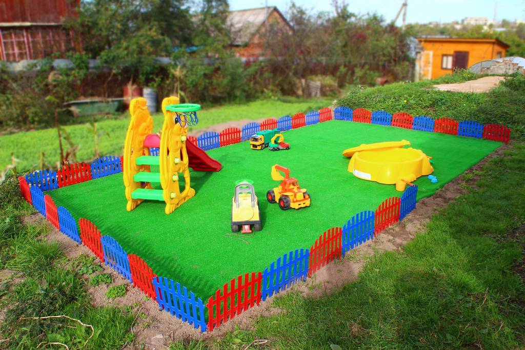 Расположите игровую платформу как можно ближе к домику. Это позволит безостановочно следить за действиями ребёнка и поможет контролировать ситуацию. Детки постарше в попечительстве нуждаются меньше, ввиду этого оборудуйте для них детплощадку подальше от родительского надзора – как вариант, за домом. Трети периметра подобает размещаться в тени. Если дачный участок обделён высокорослыми растениями, смастерите навес. Он оградит детей от переизбытка ультрафиолетом. Не обустраивайте детплощадку в местах, где присутствует избыток влажности, и нет прямого попадания солнечных лучей. Застелите землю искусственным газоном или матами. Оградите уголок изгородью, чтобы детки чувствовали себя полноправными владельцами территории.