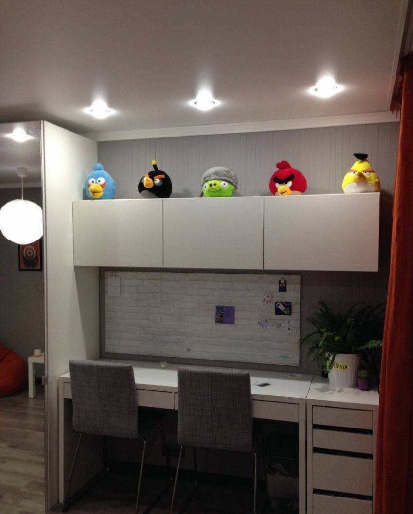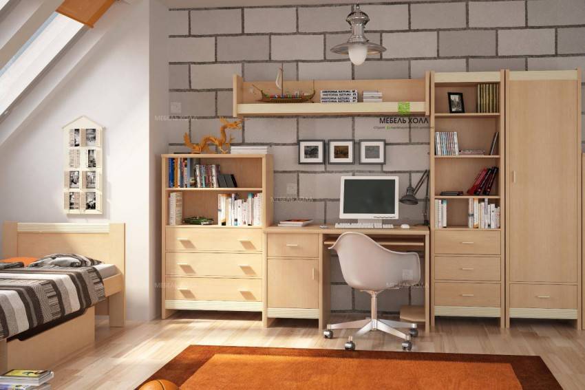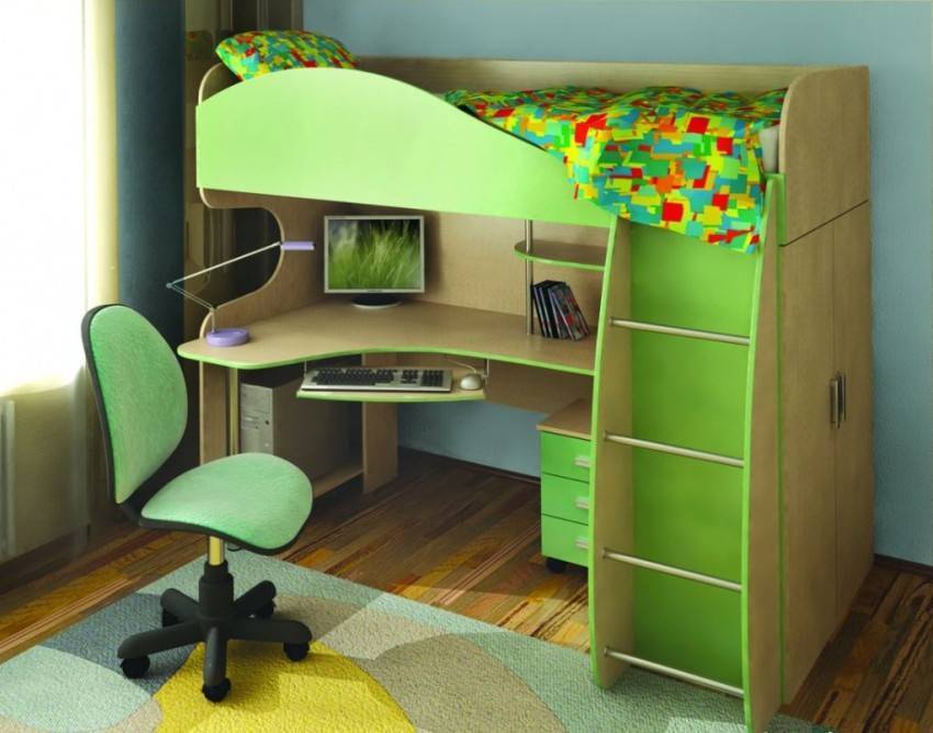- кровать чердак, а под ней стол. Рядом обычно располагают полки или узкий шкаф. В этом случае следует позаботиться о качественном освещении рабочего места;