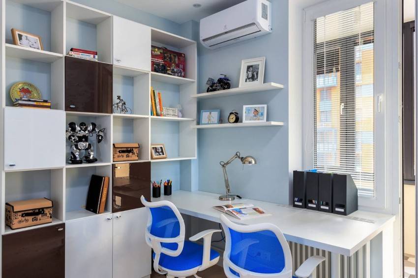 Если в семье 2 и более детей, которые имеют общую детскую комнату, то хорошим вариантом будет удлиненный вариант столешницы. Она сможет обеспечить письменную поверхность сразу для двоих. Для экономии пространства отлично подходят угловые варианты столов. При этом системы хранения книг и учебников можно сделать навесными.
