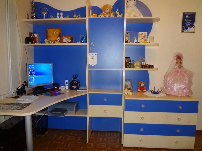 Оптимальным решением специалисты называют приобретение цельного гарнитура для детской комнаты. Получится компактно разместить не только рабочее место ребенка и места для хранения школьных/учебных принадлежностей, но и предусмотреть полочки, ящики, корзины для хранения игрушек, вещей, предметов обихода. Да, такие цельные гарнитуры стоят дорого, но и уровень качества, функциональности у них очень высокий.