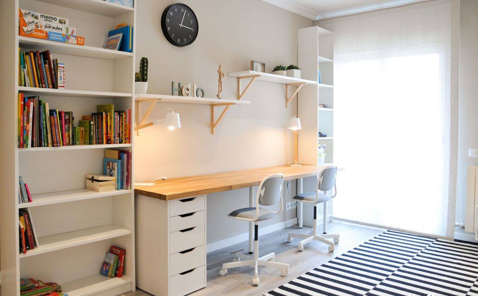 Производители выпускают письменные столы для двух детей, они оснащены большой столешницей и набором полочек и ящичков с двух сторон или посередине. Главное, чтобы в комнате было достаточно места для его размещения. А также здесь следует продумать дополнительное освещение для двух рабочих мест.