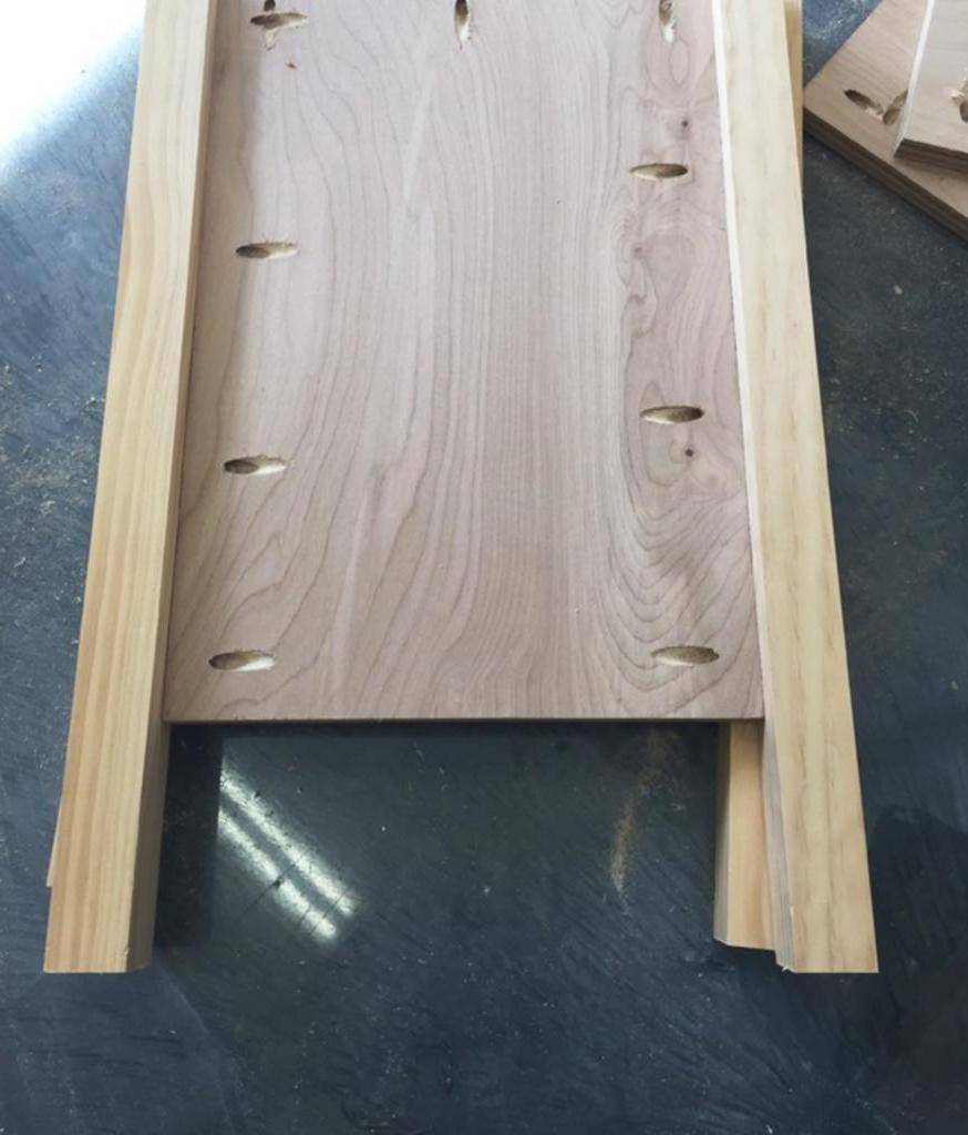 Я распилил фанеру в магазине пиломатериалов и проделал поперечные щели дома на торцовочной пиле. Затем использовал дрель, чтобы просверлить отверстия для дюбелей диаметром 2 см в боковых частях основания тумбы. Далее было применено приспособление для сверления отверстий под штифты во внутренних боковых частях. В итоге у вас будет 4 части с отверстиями для дюбелей с одной стороны и отверстиями для штифтов – с другой.