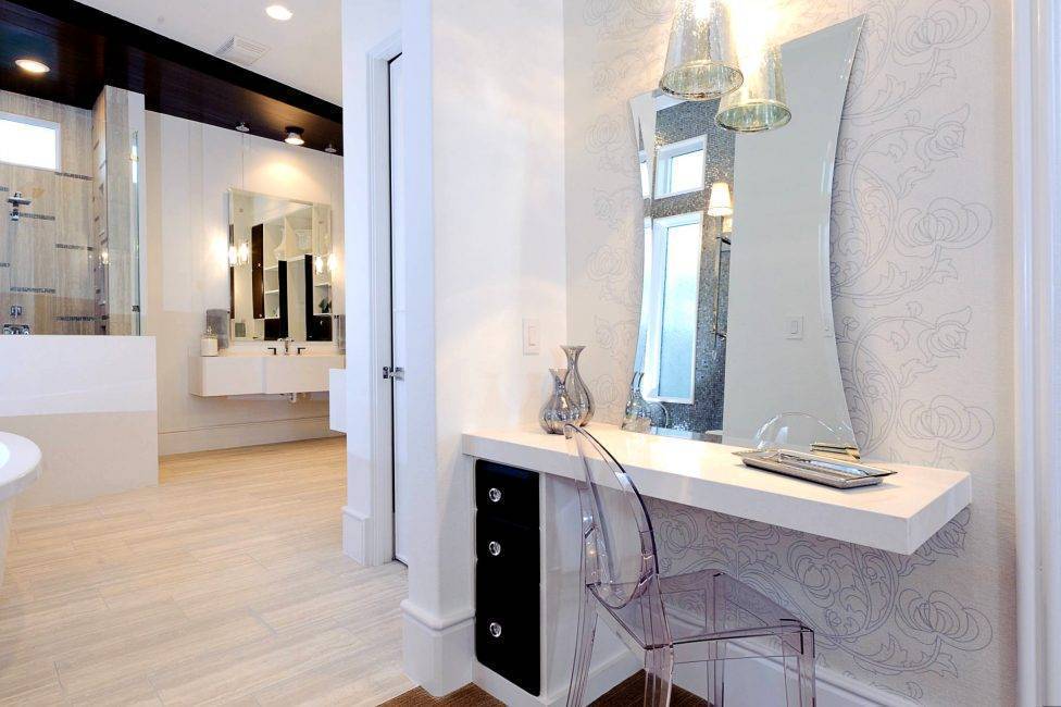 Импровизированный туалетный столик может состоять из зеркала, закрепленного на стене, и компактной полки или узкой консоли. Легко, удобно и стильно!