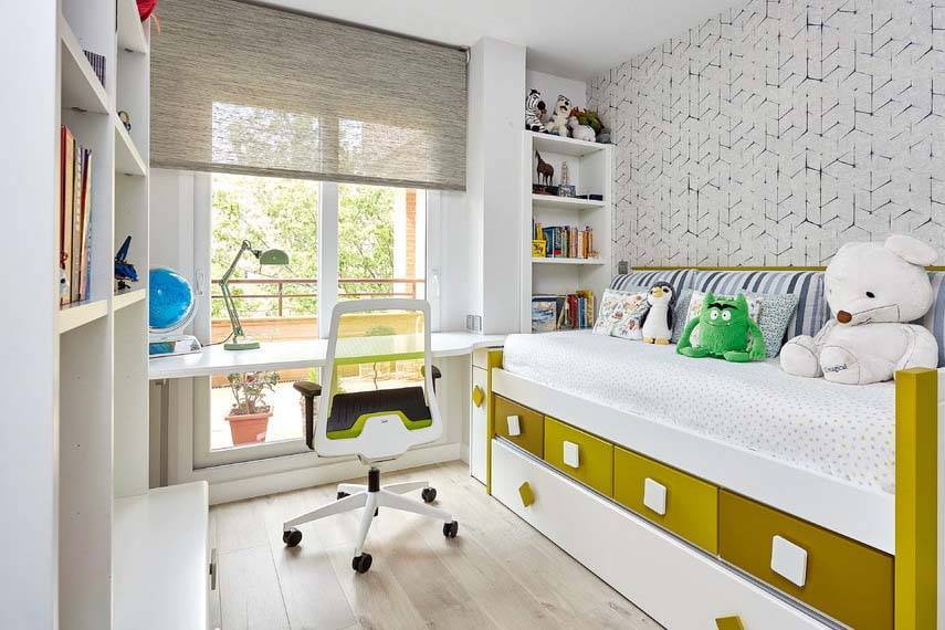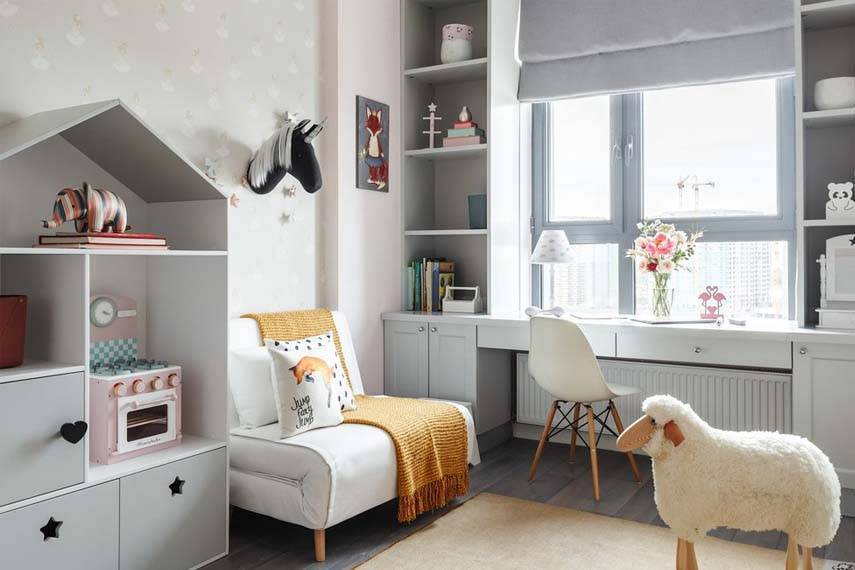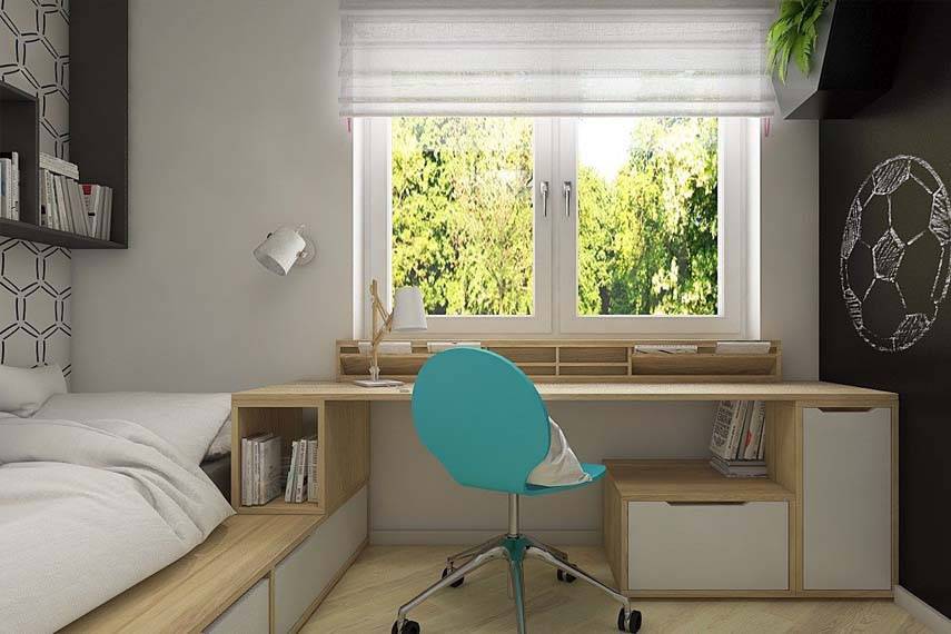 В малогабаритной детской стоит подумать о совмещении подоконника со столом. Это позволит выиграть драгоценное пространство, чтобы оставить чуть-чуть места для игр