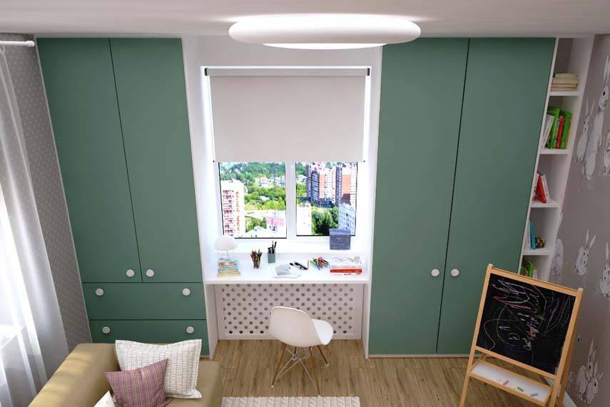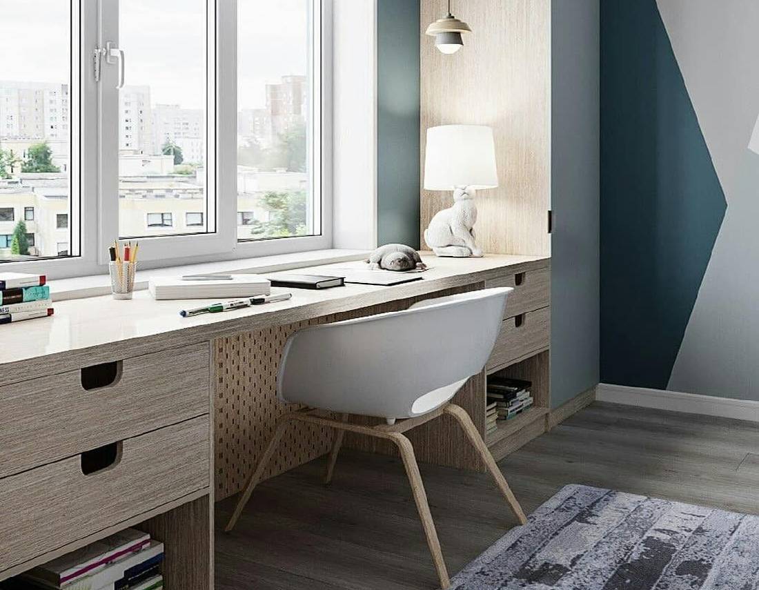 Чтобы поставить длинный стол вдоль окна, нужно провести замеры и решить, не будут ли батареи упираться ребёнку в ноги. Если такая вероятность существует, лучше заказать широкую столешницу или подоконник.