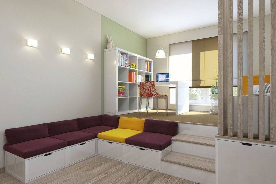 Подиумы – весьма реальный, функциональный вариант. Так можно выделить спальню, гостиную, а для семьи со школьником-ребенком это и вовсе находка. Ведь в подиуме можно разместить полки с одеждой и бельем, а на нем – учебное место с кроватью.