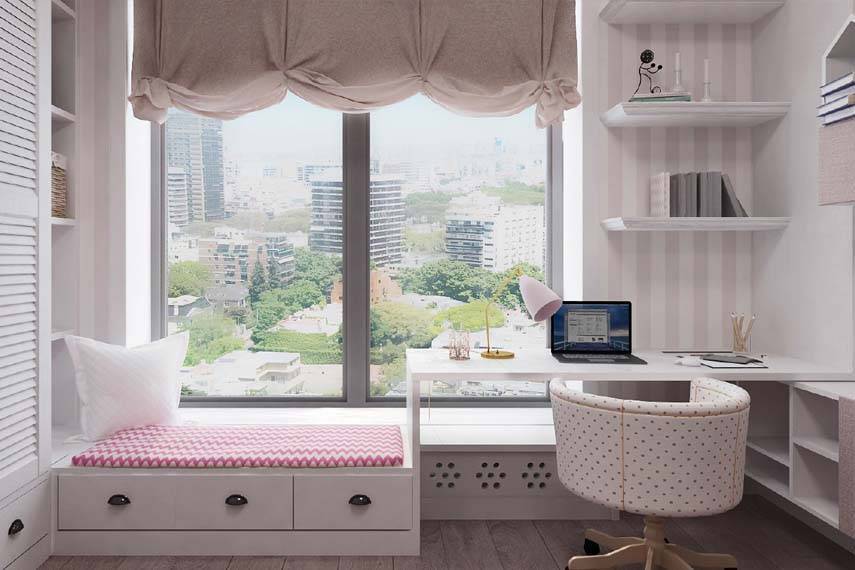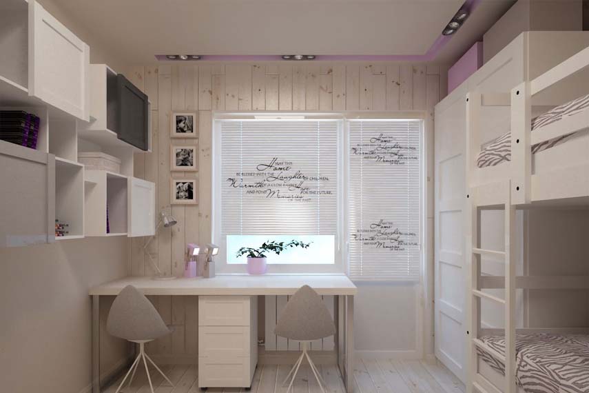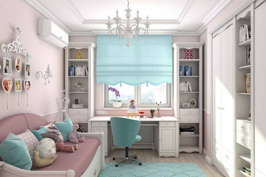 Если в комнату нужно поставить 2 стола у окна в детской, важно позаботиться о том, чтобы у каждой девочки было место для хранения тетрадей, ручек, книг и одежды