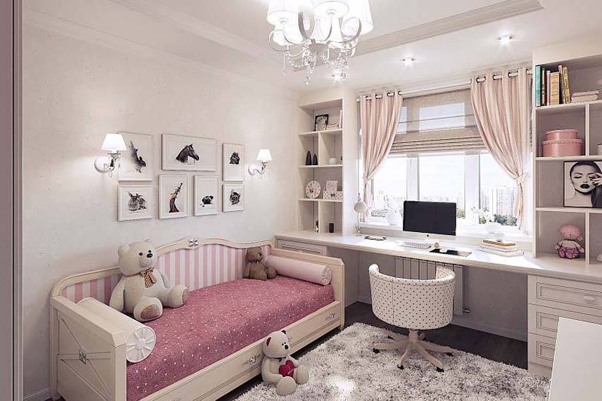 Девичьи цвета весьма многообразны: вся пастельная гамма, а также розовый, красный, белый, металлик и многие другие. При выборе цветов стоит помнить о том, что обстановка детской должна настраивать на рабочий лад и не отвлекать от учебного процесса. Поэтому стоит отказаться от доминирования слишком ярких красок, отдав предпочтение сдержанным оттенкам. В этом случае интерьер можно будет легко поменять с помощью новых ярких аксессуаров.