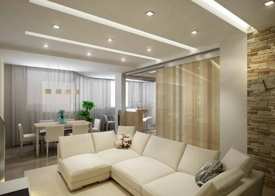 Планировка просторной однушки может быть выполнена с помощью света, а также отделочных материалов