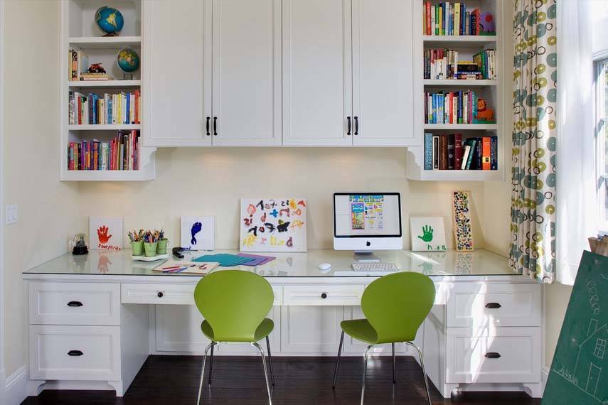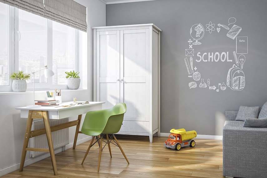 В рабочей зоне не должно быть отвлекающих предметов: телевизора, игрушек. Считается, что зелёный цвет усиливает концентрацию, поэтому стену перед столом можно оформить в мягких оттенках зелёного.
