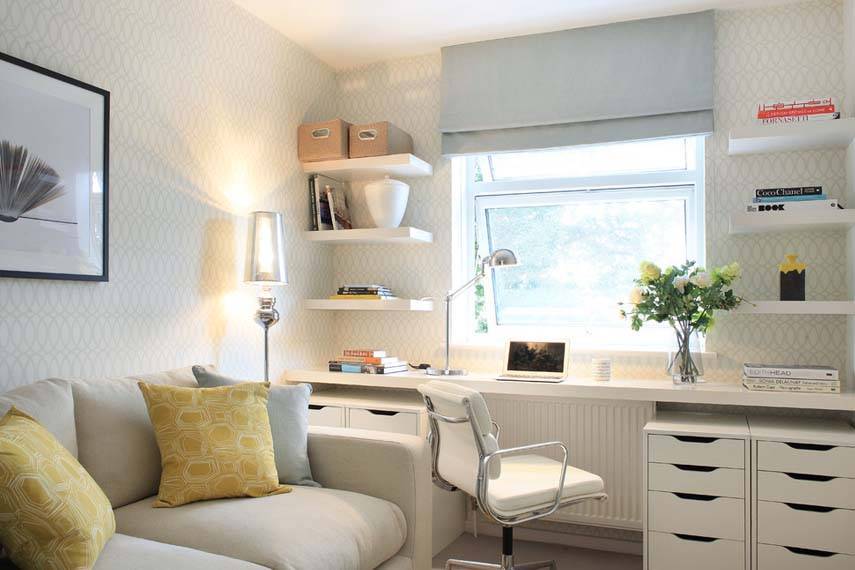 Длинный стол можно встроить в пространство между противоположными стенами, тогда получится организовать объемную систему хранения сверху и под столешницей. Преимущество подобного решения в том, что комната не выглядит загроможденной, даже если полки займут весь простенок до самого потолка.